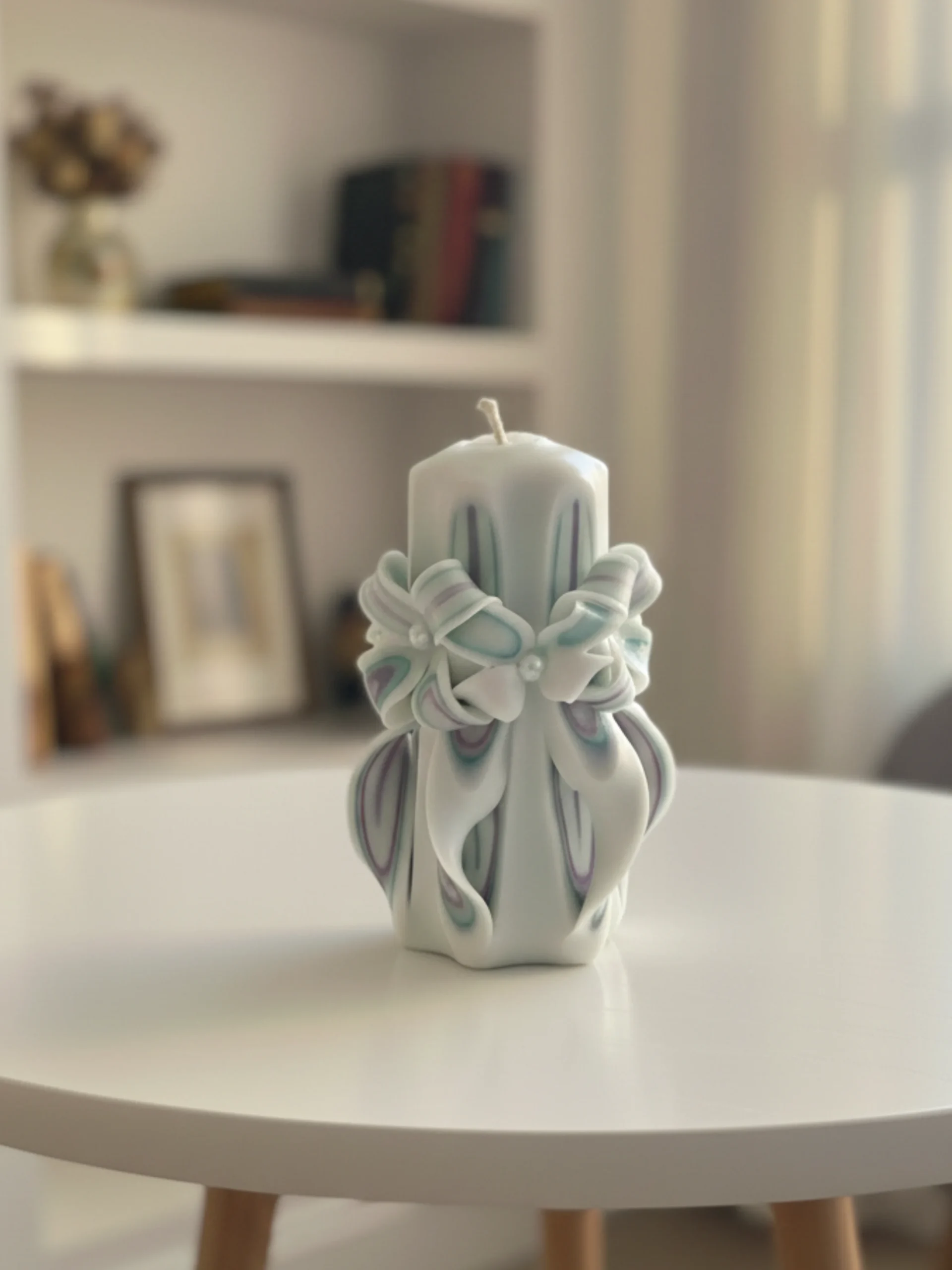 This hand-carved candle is a true decorative statement, combining soft green, pink, and white tones in a carefully sculpted design. Each detail is carved by hand, giving the candle a unique artistic character that reflects craftsmanship and patience.
