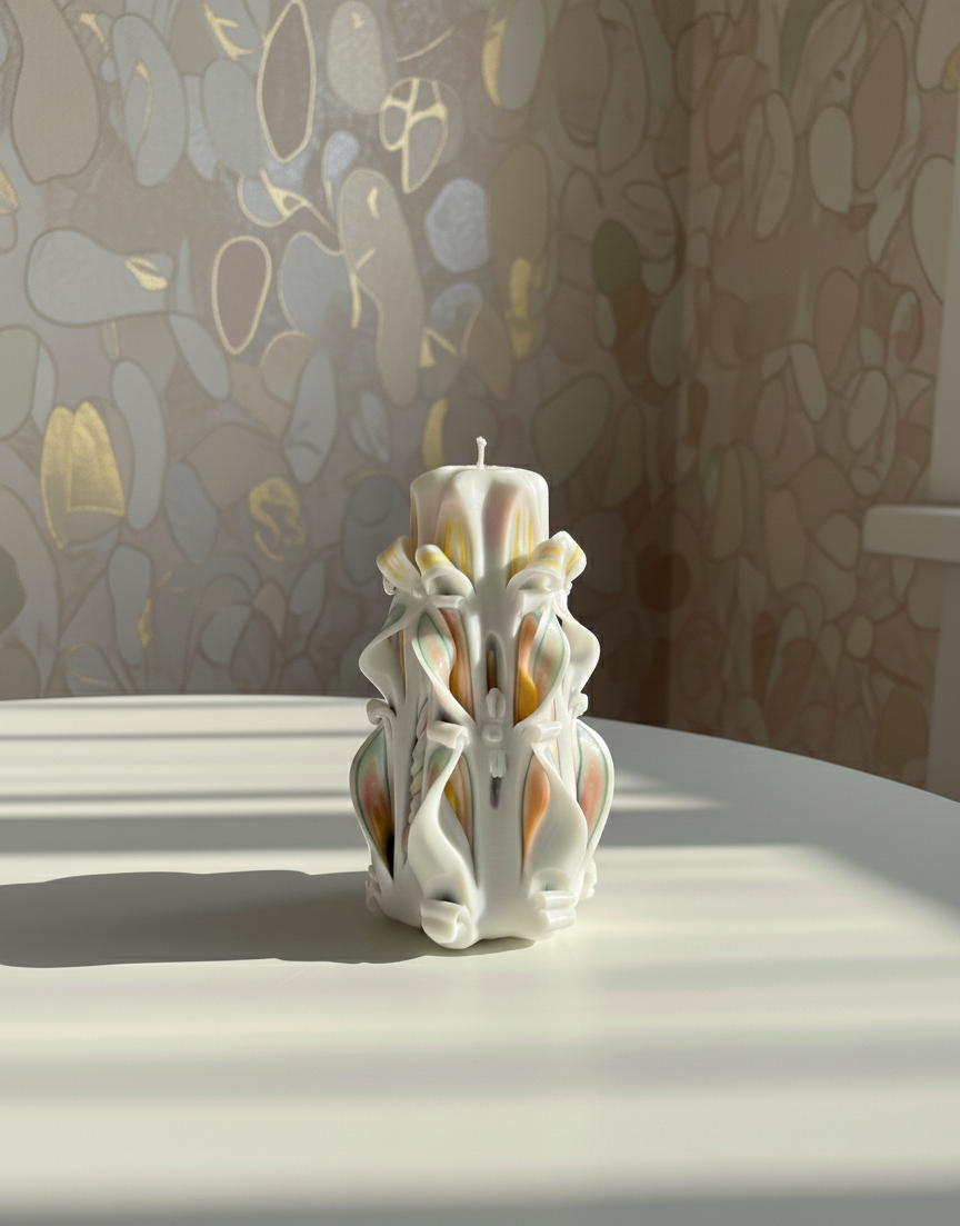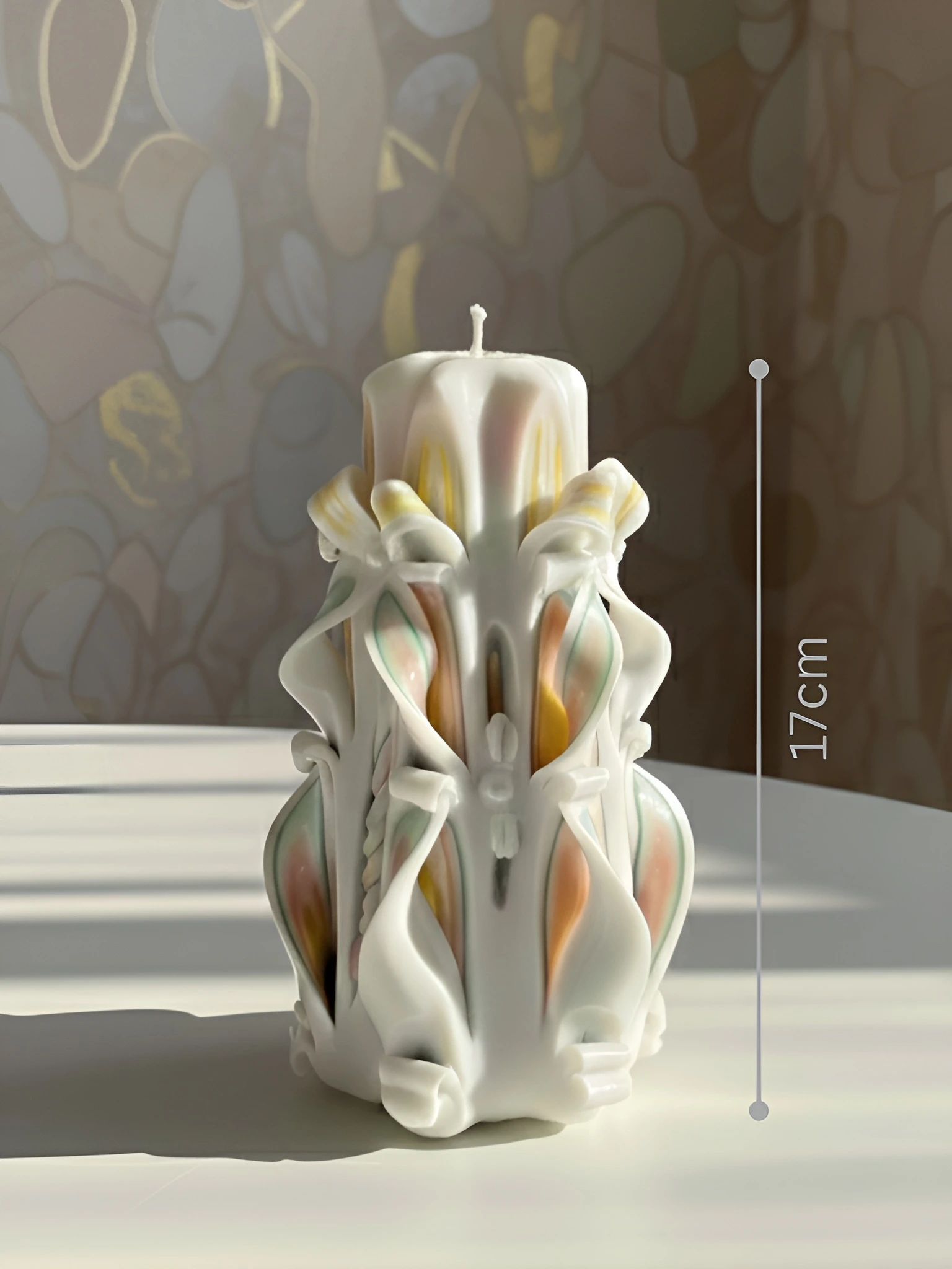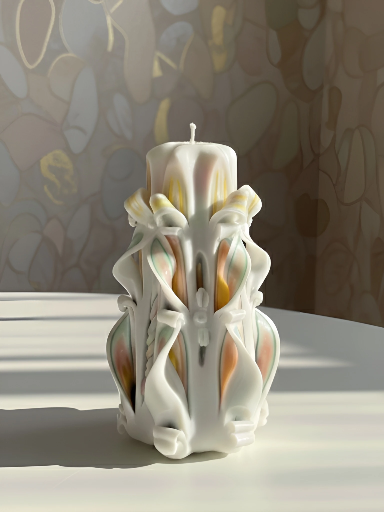 This hand-carved candle is a refined example of true handmade craftsmanship. Each piece is carefully shaped by hand, revealing intricate carved details enhanced by a harmonious blend of green, yellow, and white tones.