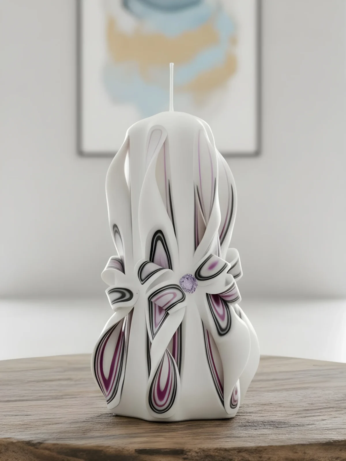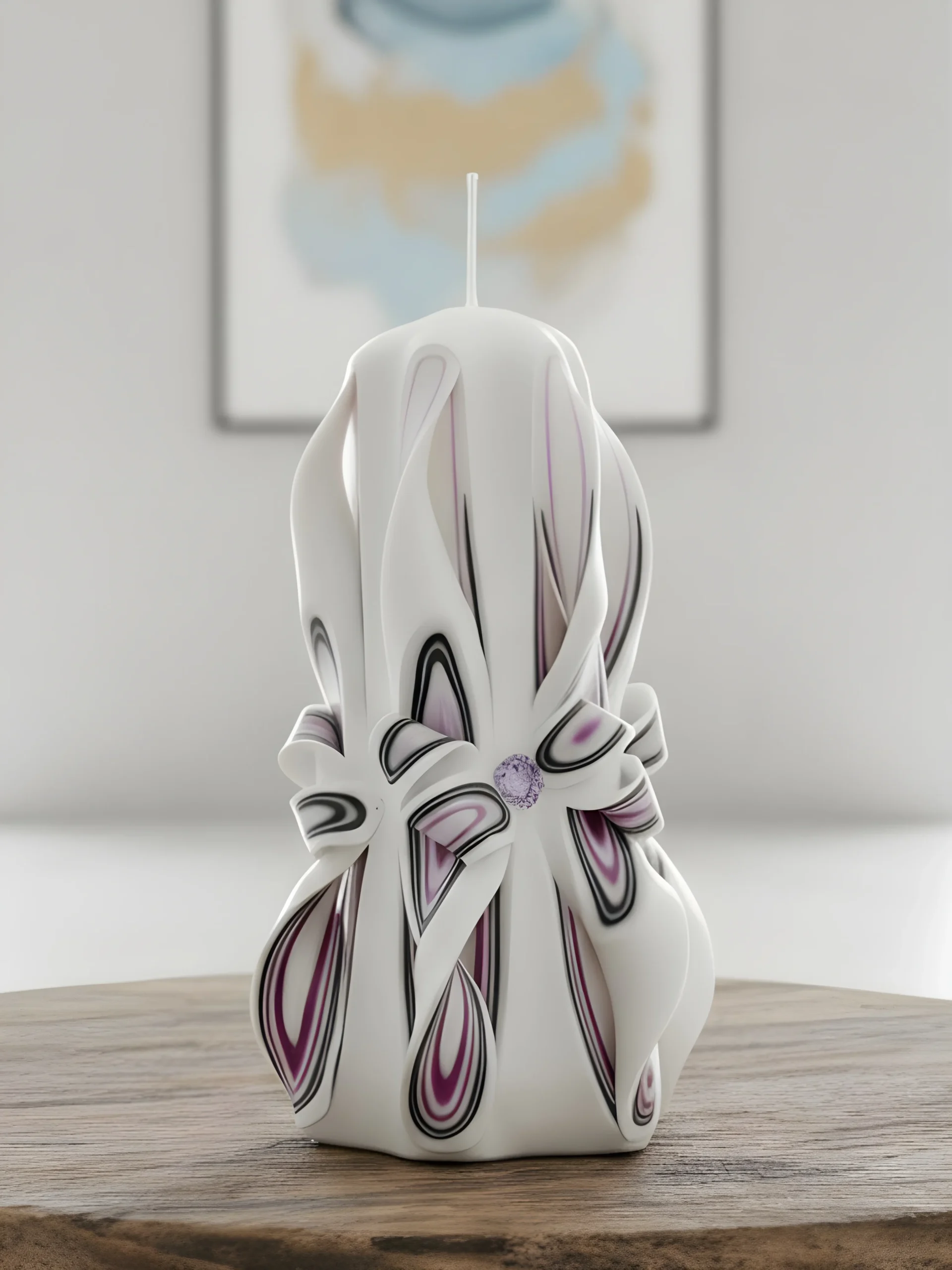 This luxury handmade candle is meticulously hand-carved in our LUMEINAS workshop, making it a truly unique birthday gift candle and a perfect special occasion candle. Crafted from high-quality paraffin wax, this unscented carved candle blends elegant black, white, and lavender colors to add a bold yet refined touch to any home decor.