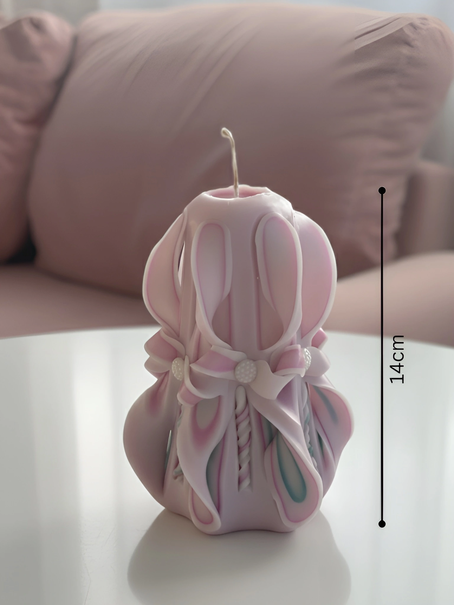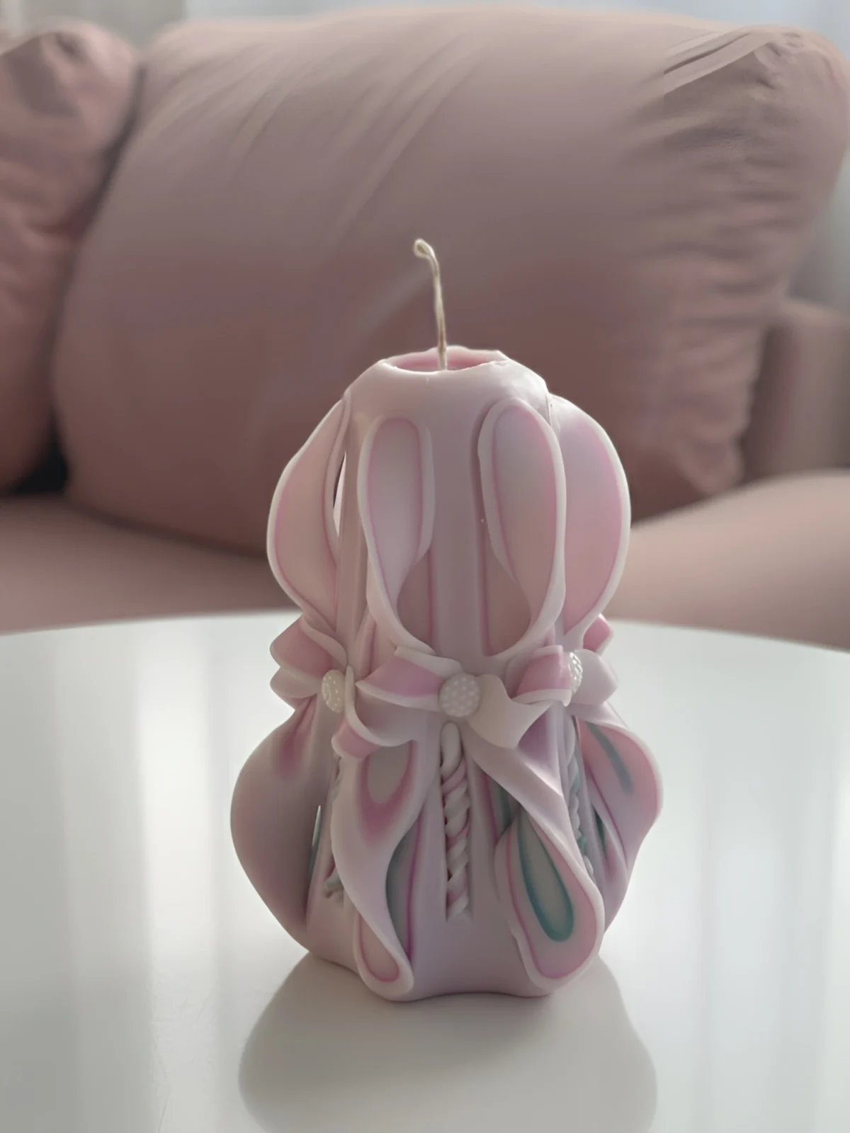 This hand-carved candle is a true expression of craftsmanship and patience. Created entirely by hand, it features a refined blend of pink, green, and white tones that flow naturally through its intricate carved patterns.