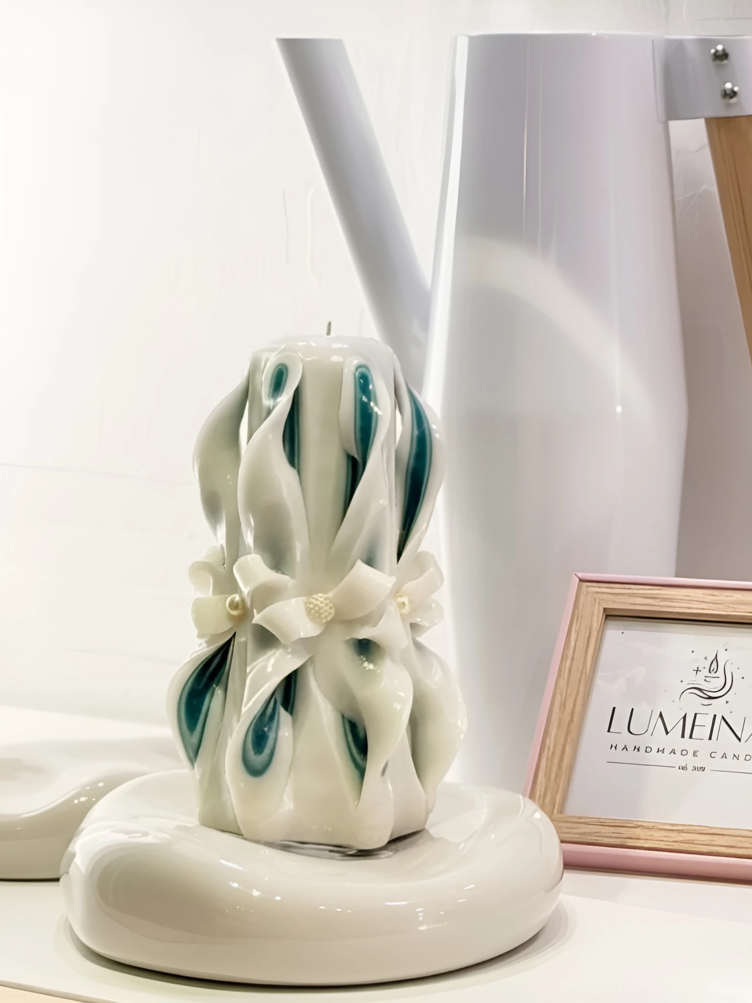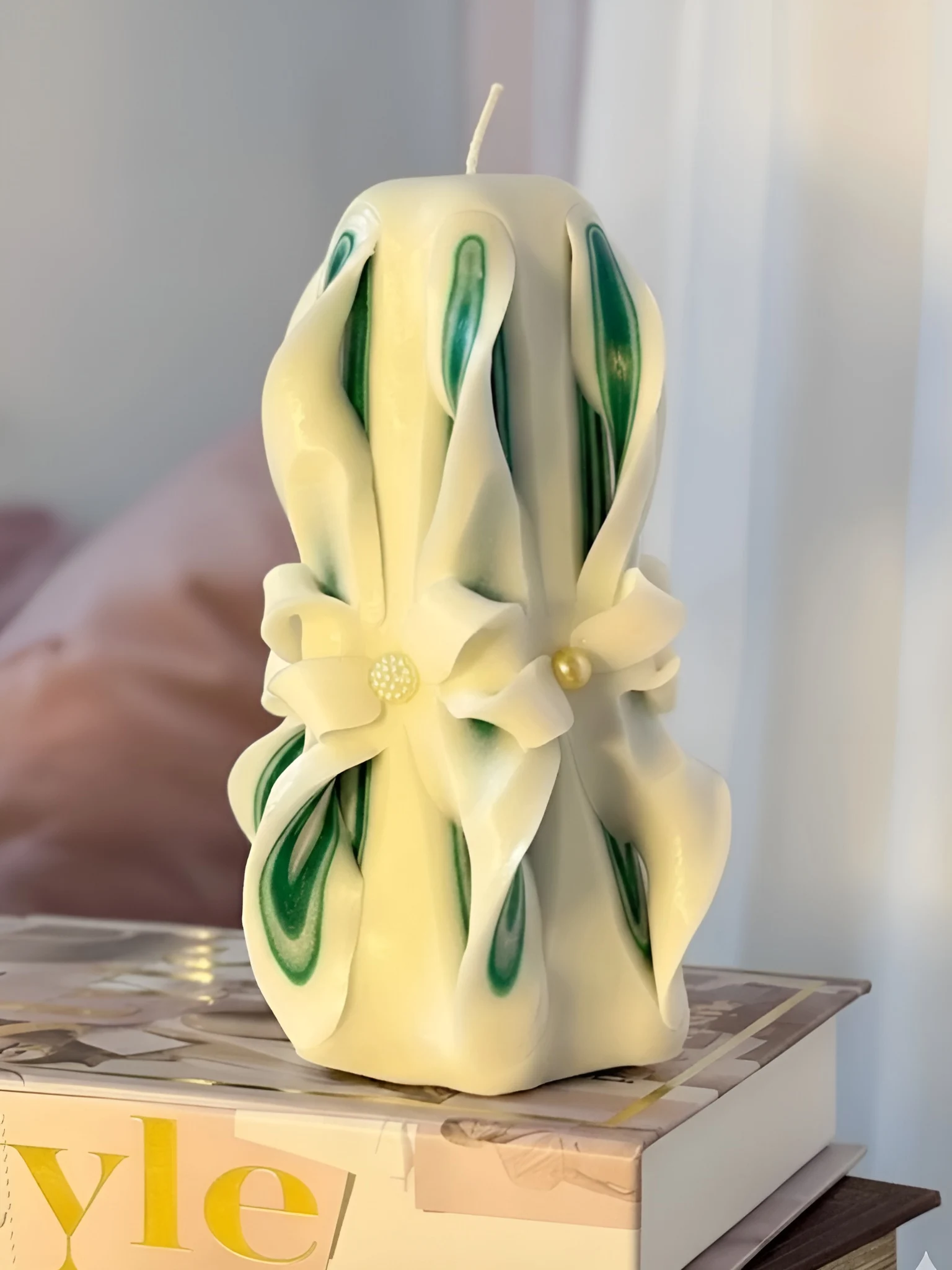 We still remember the first time we carved this luxury handcrafted candle in soft shades of green and white, right here in our peaceful workshop in the German countryside. A delicate design, brought to life with shimmering pearl-like beads that add a refined, graceful touch.