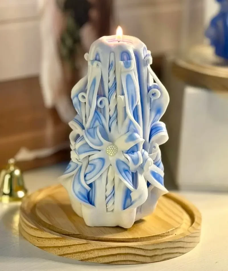 At LUMEINAS, we don’t just make candles — we sculpt stories in wax. This handcrafted candle is a piece of décor with meaning. Layered in calming shades of blue and white, and finished with intricate flower carvings and elegant artificial beads, it’s not your average candle — it’s the kind you stop and stare at.