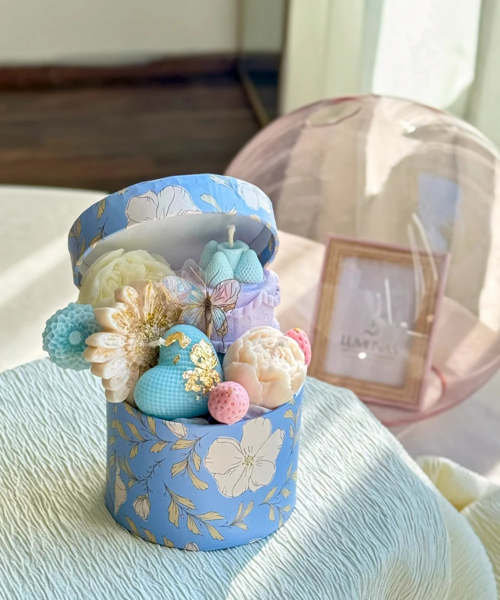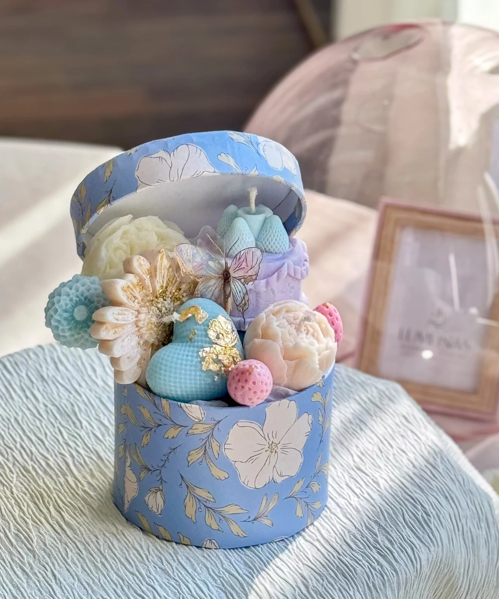 Inside the box, you’ll find a charming birthday cake candle handcrafted from soy wax, delicate peony and daisy wax flowers, a sweet heart-shaped candle, and more — all in soft pastel tones. These are perfectly paired with dried flowers that add a rustic, natural appeal to the arrangement. This thoughtful mix creates a unique blend of lasting floral beauty and cozy ambiance, making it an ideal birthday gift box for anniversaries, weddings, or any special occasion.