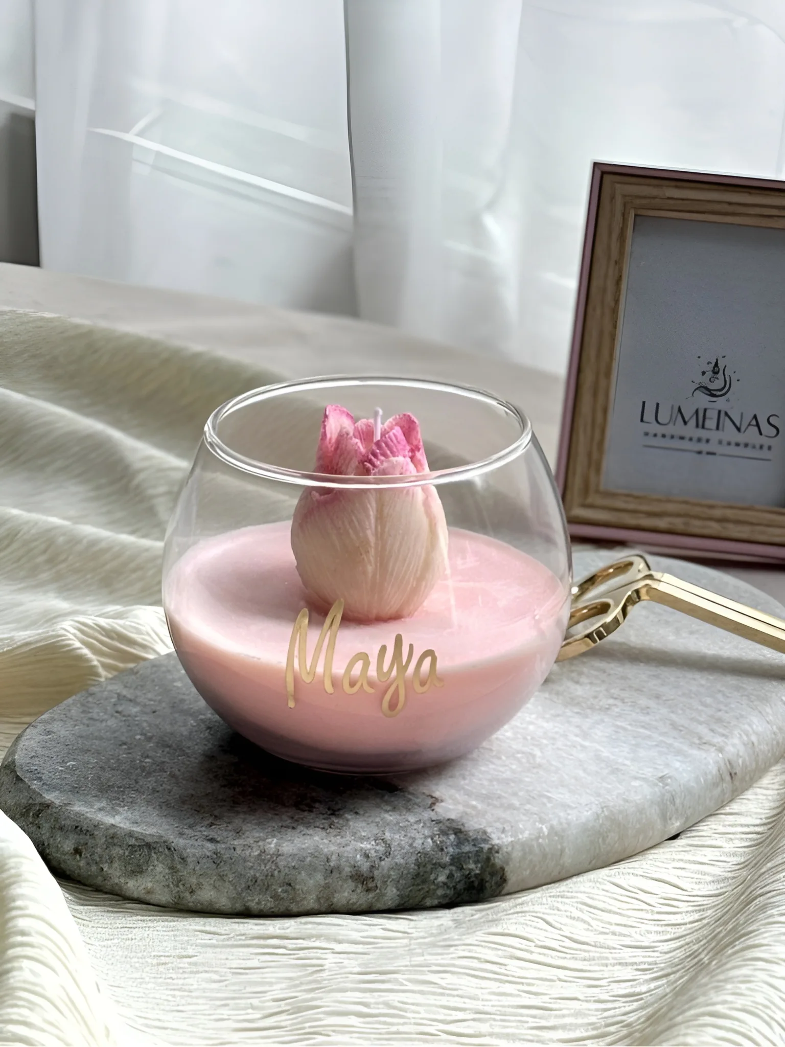 The colors — soft white, gentle pink, and natural hues — are chosen based on what our customers love, bringing calm and beauty to any room. The candle is lightly scented, and you can choose the fragrance from the available list. It’s fully customizable — just let us know if you want to add a name or your favorite scent to make it truly yours.
