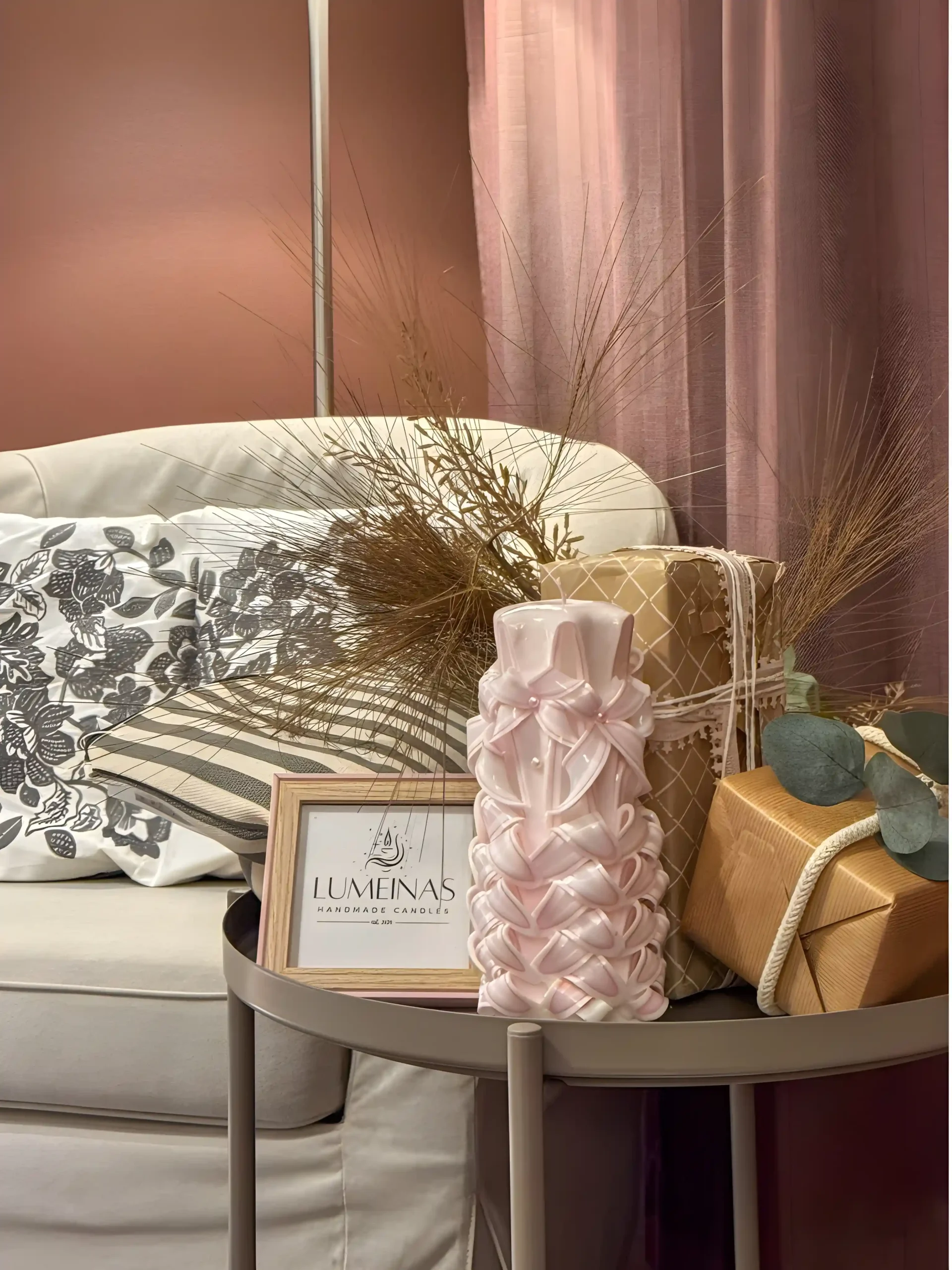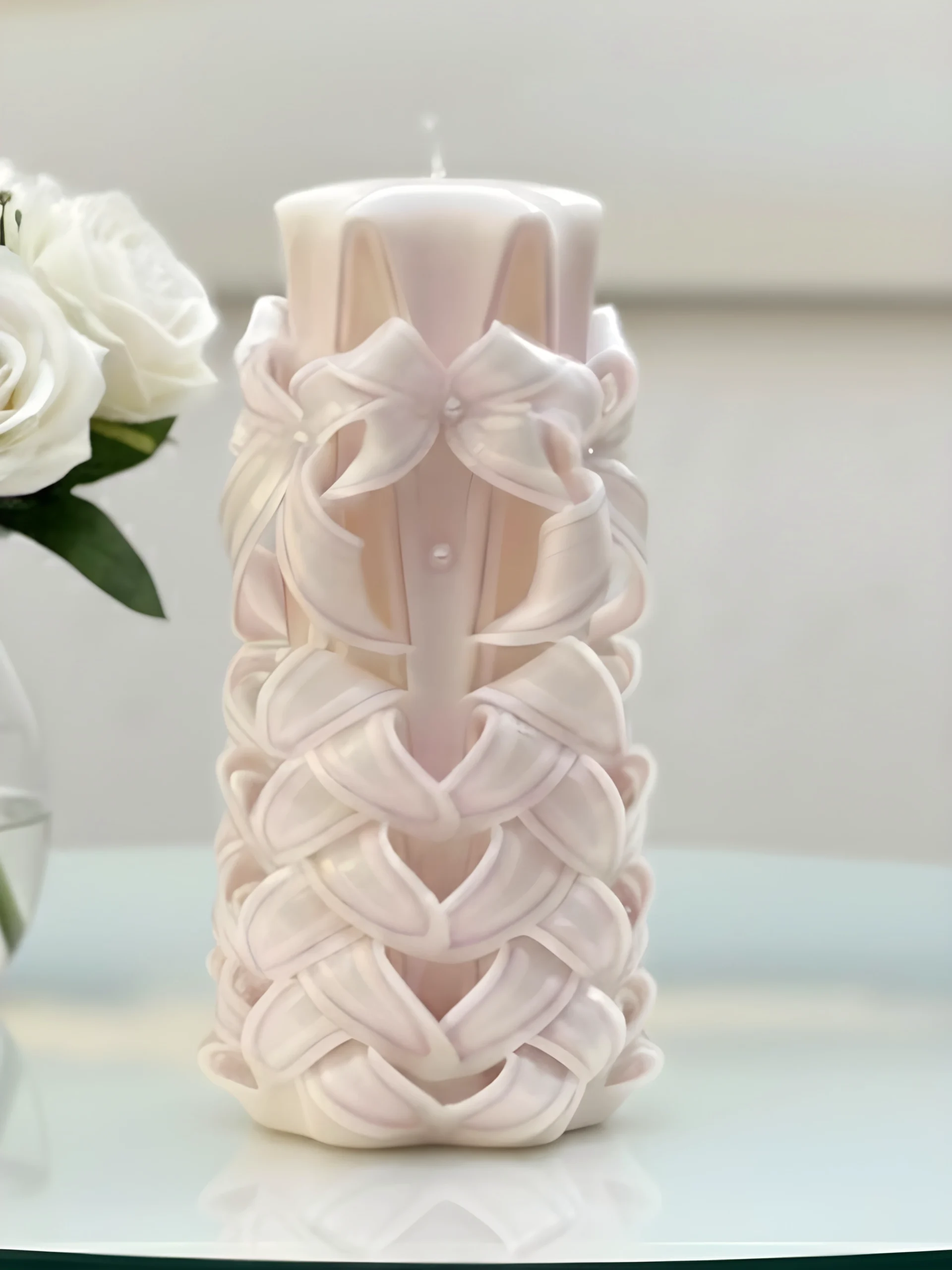 A large hand-carved candle in soft pink and white — rare, precious, and crafted to stand out on the bride and groom’s table. It adds a touch of elegance and warmth to the celebration — a centerpiece that draws attention and leaves a lasting impression in both photos and memories.
