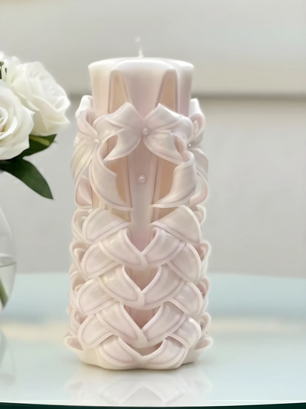 This particular unique candle is designed with delicate pink and white layers, chosen to create a soft, graceful appearance that fits seamlessly into any modern or classic décor. Its layered design and detailed carving make it not only visually stunning but also rich in character, making it a beautiful statement piece.